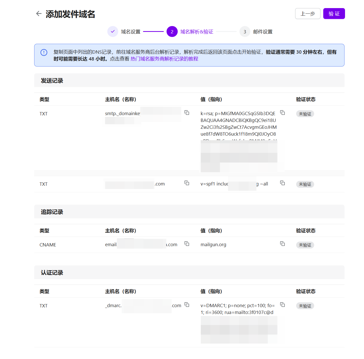 - 追踪记录(CNAME):用于启用邮件投递追踪与统计功能。