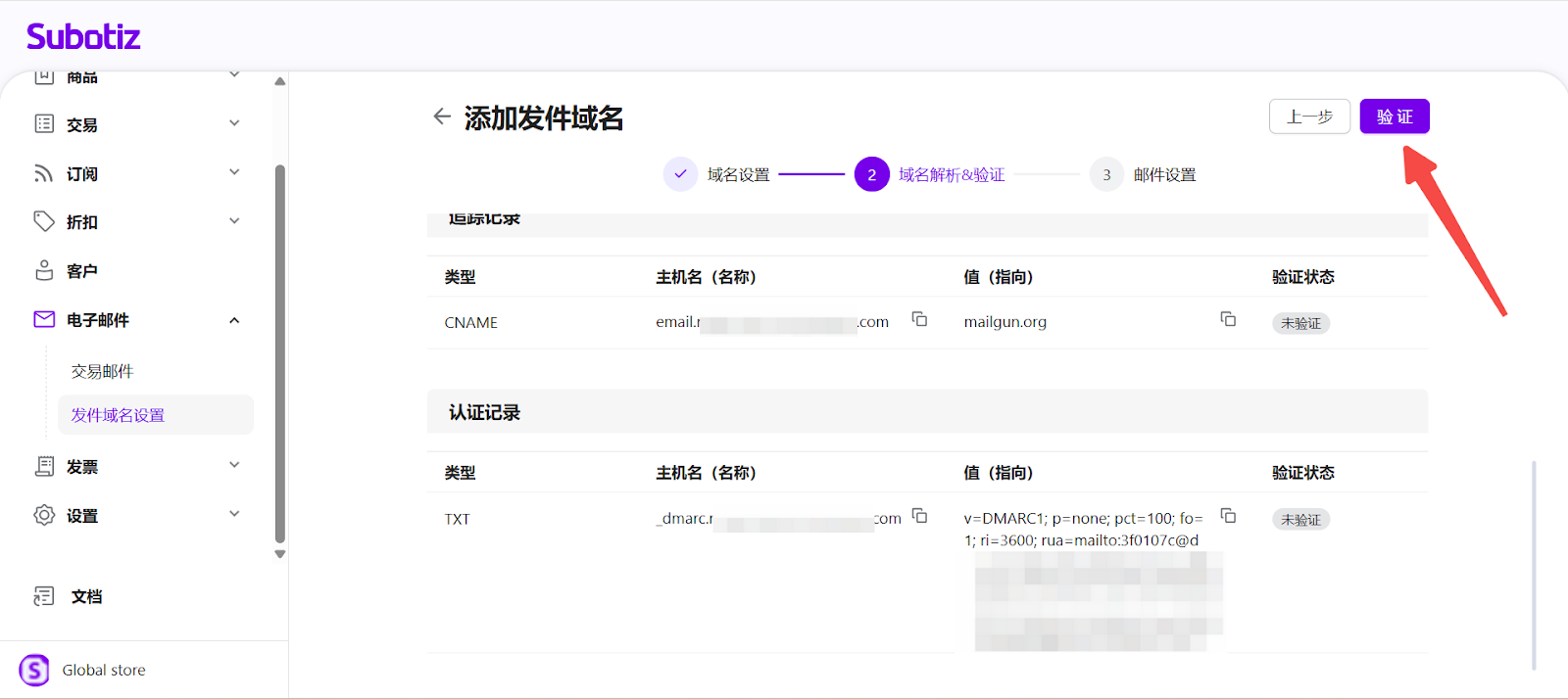 - 配置 DNS 记录:在 域名解析&验证 步骤中,将 Subotiz 显示的 DNS 记录复制到您的域名注册商后台。