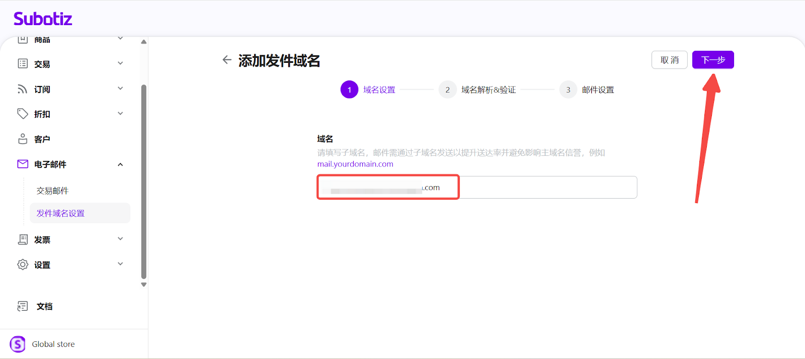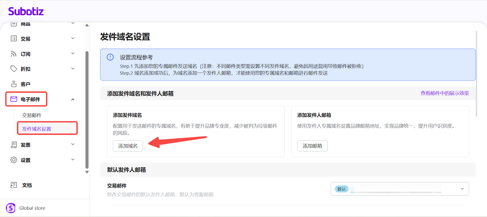 - 进入发件域名设置:在 Subotiz 后台进入 电子邮件 > 发件域名设置,点击 添加域名。