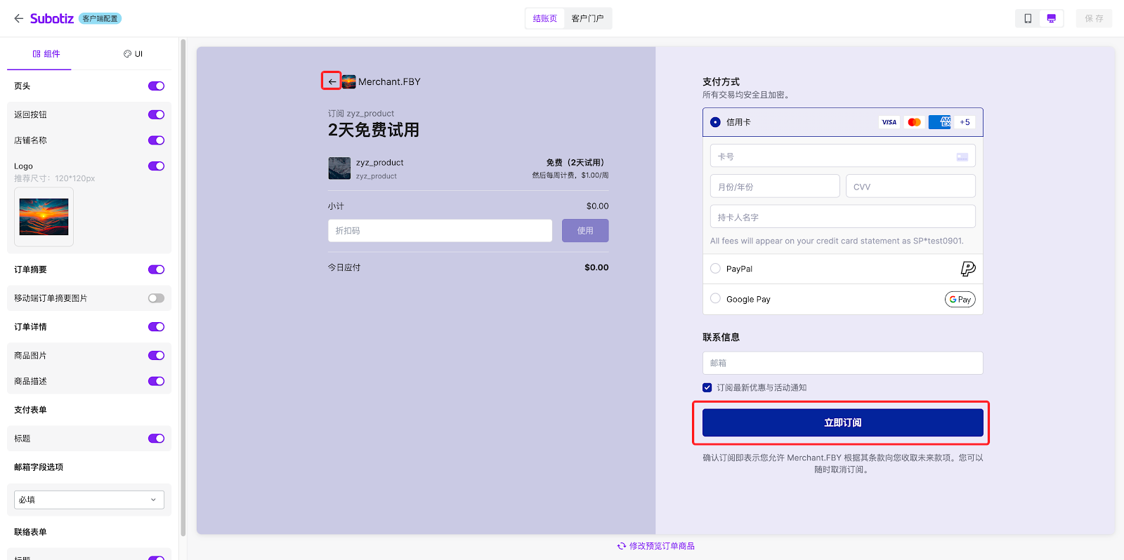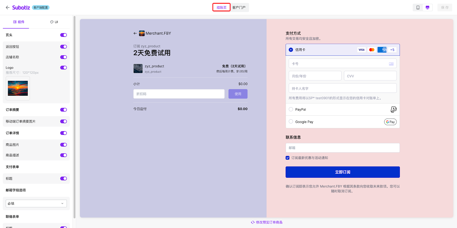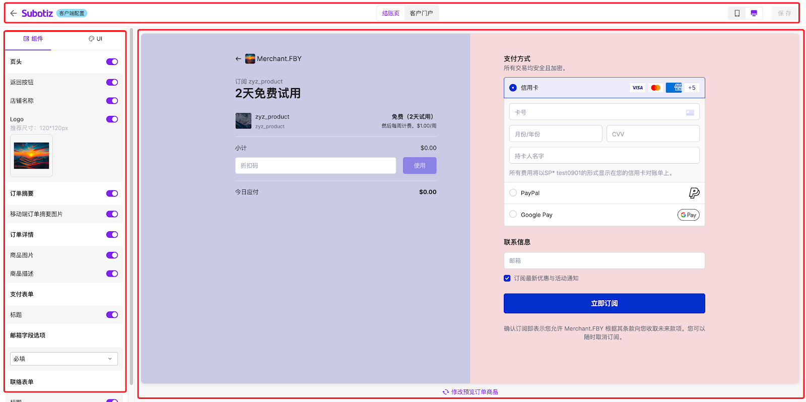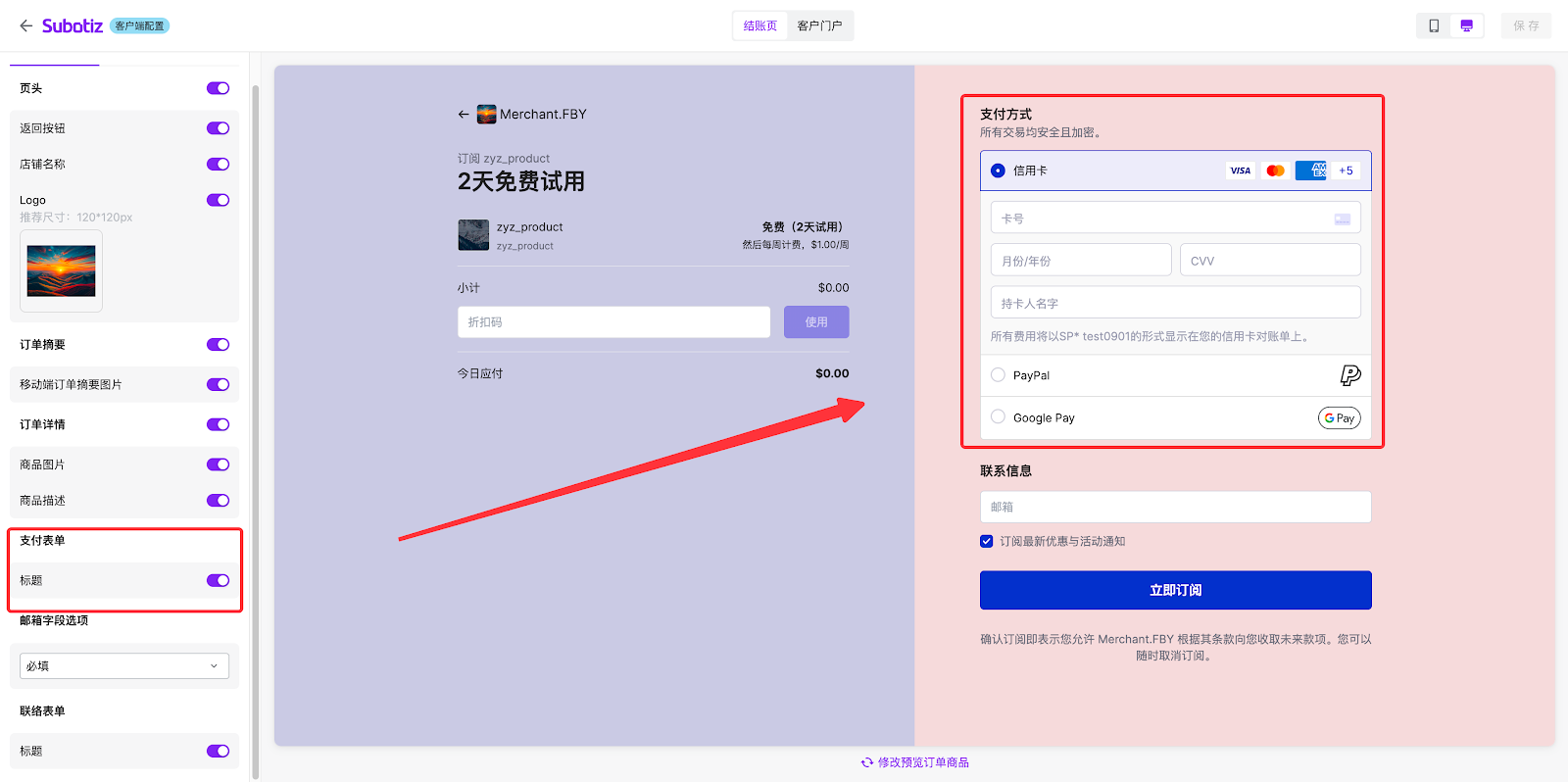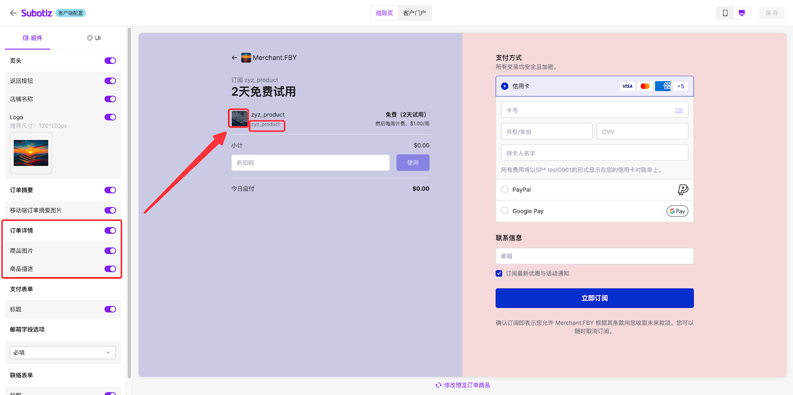 - 该区域可预览订阅的商品详情、支付表单及联络表单。