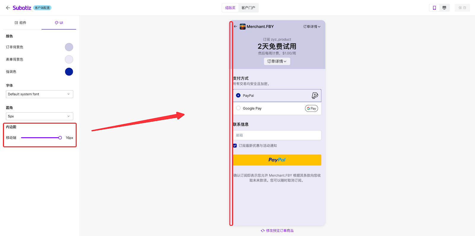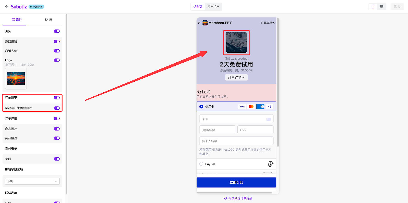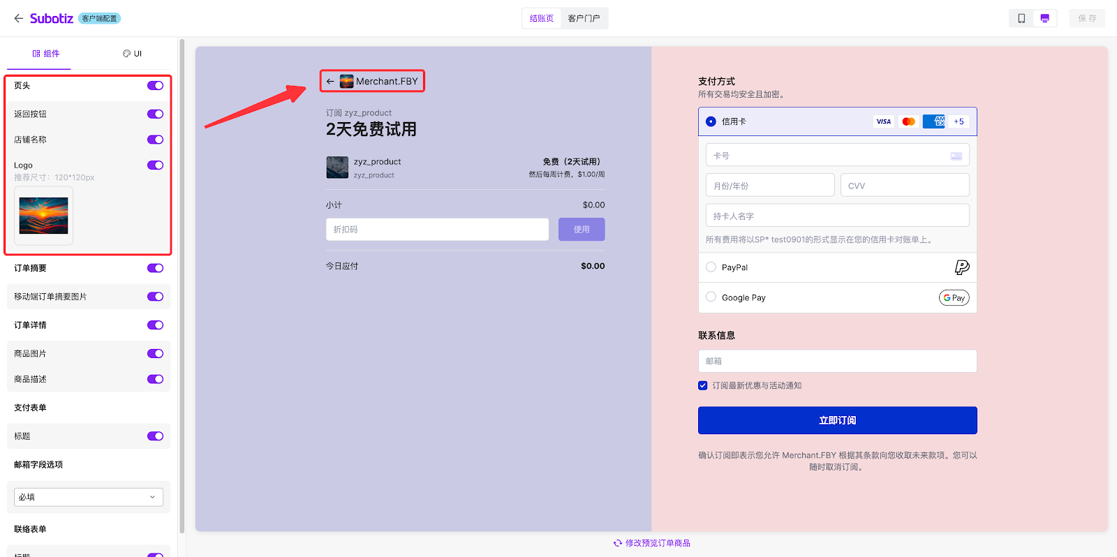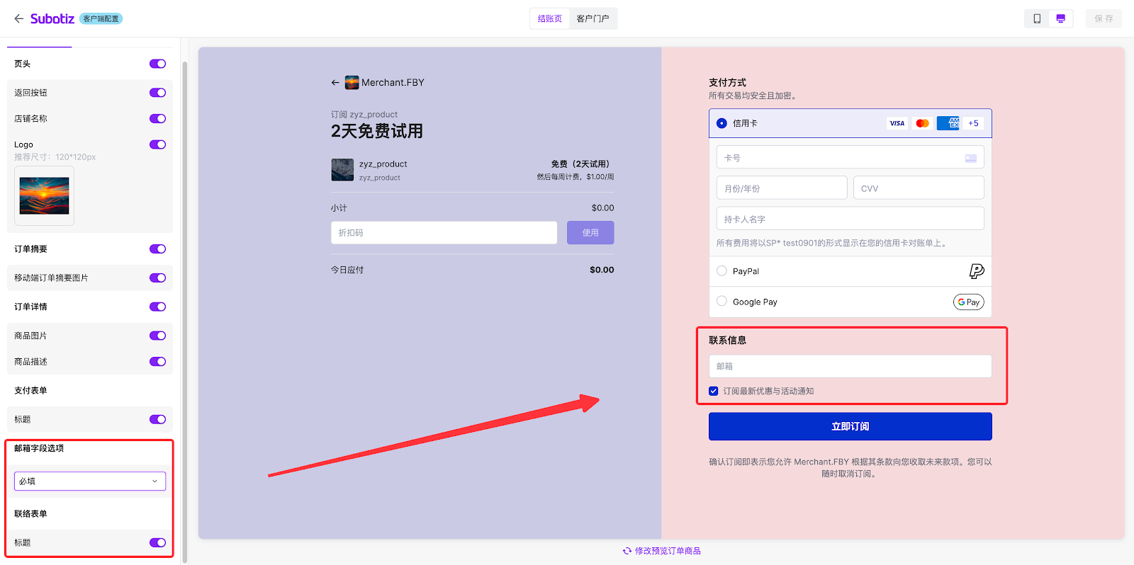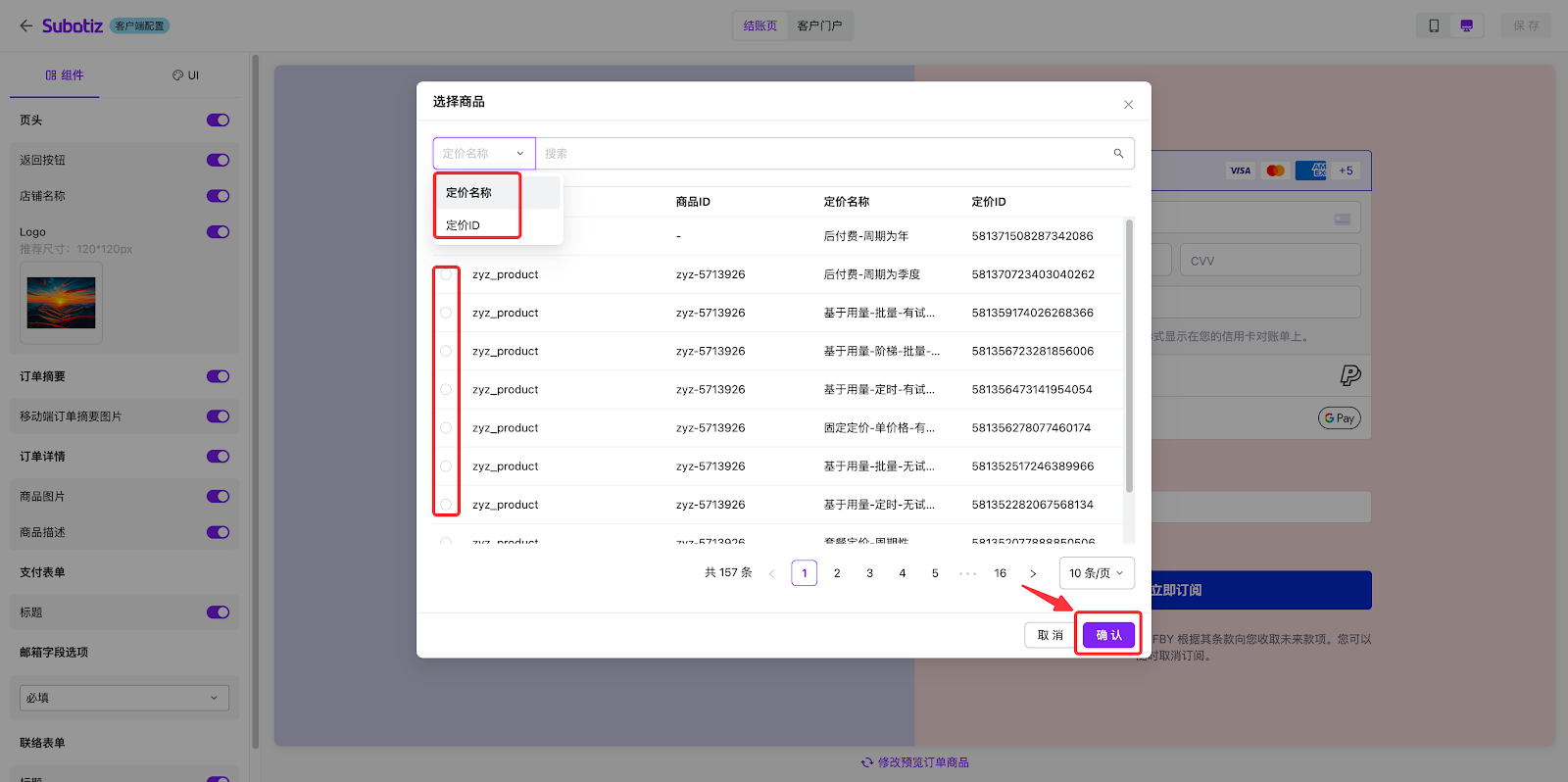 - 该区域可预览订阅的商品详情、支付表单及联络表单。