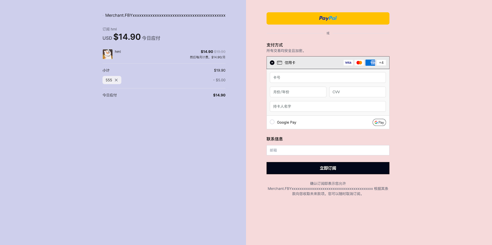 发起结账后,Subotiz将渲染一个结账页面显示订单详情,并通过表单收集顾客的电子邮件(支持自定义配置是否要求客户提供电子邮件)。同时,该页面上还会显示支付表单,包括银行卡支付表单以及Subotiz支持的其他支付方式,如Google Pay、Apple Pay和PayPal。