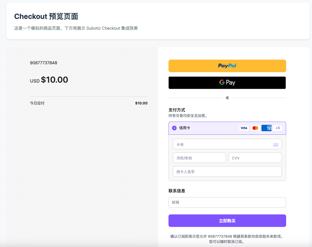 发起支付后,在您网站或应用的同一框架内将打开一个完整的页面或部分组件 。二者都不再显示订单详情,但仍会要求客户提供电子邮件。组件中包括银行卡支付表单以及Subotiz支持的其他支付方式,如Google Pay、Apple Pay和PayPal;当嵌入完整页面时,除了组件支持的表单外,会额外显示订单总金额信息。
