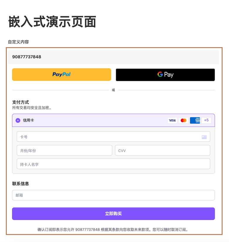 嵌入式支付模式将通过联系表单收集客户联系信息,但不涉及产品/订阅管理,仅处理支付流程。支付时,客户不仅可以看到银行卡支付表单,还可以选择使用PayPal、Apple Pay和Google Pay进行支付。