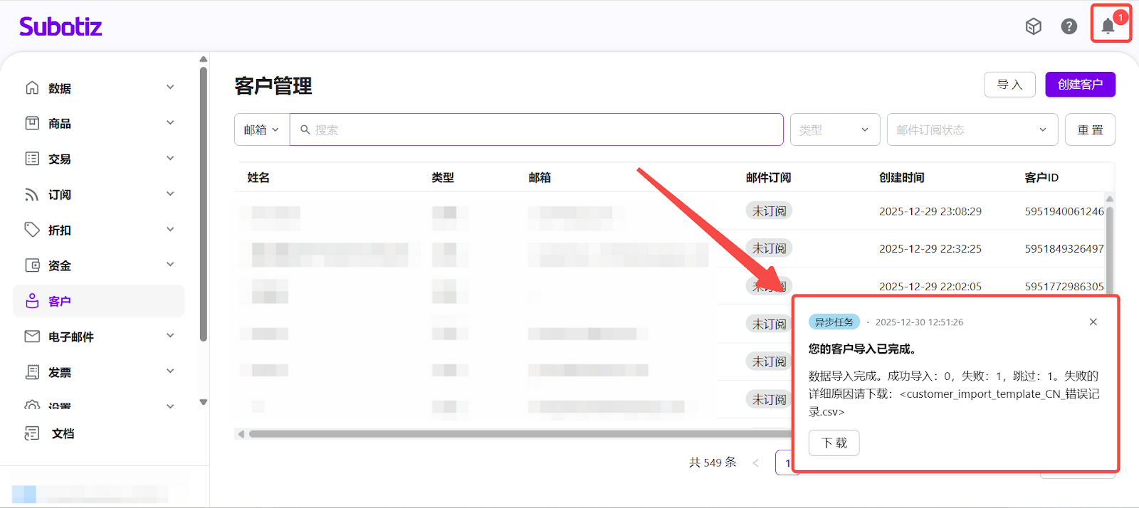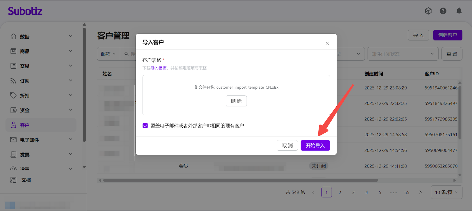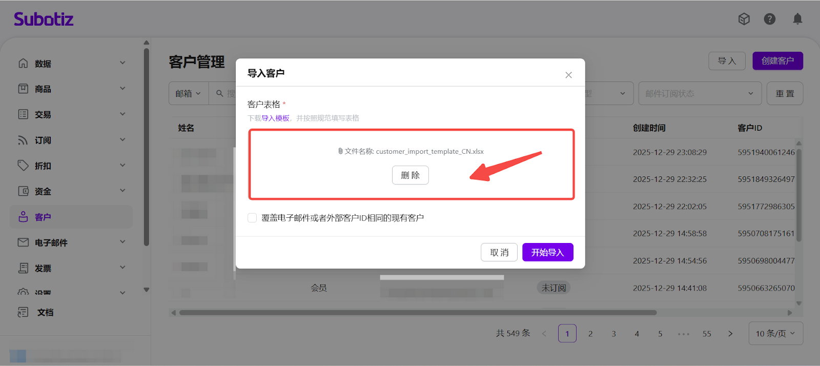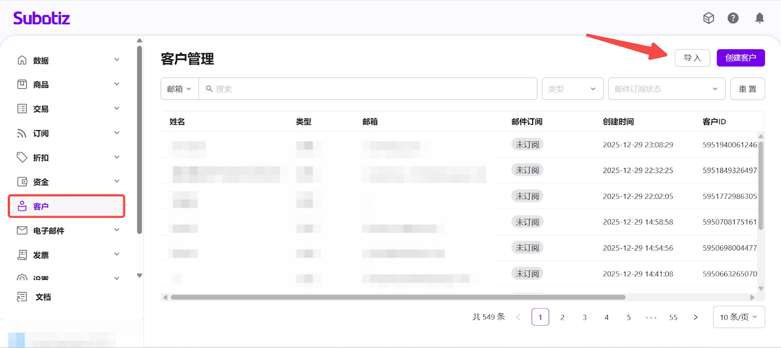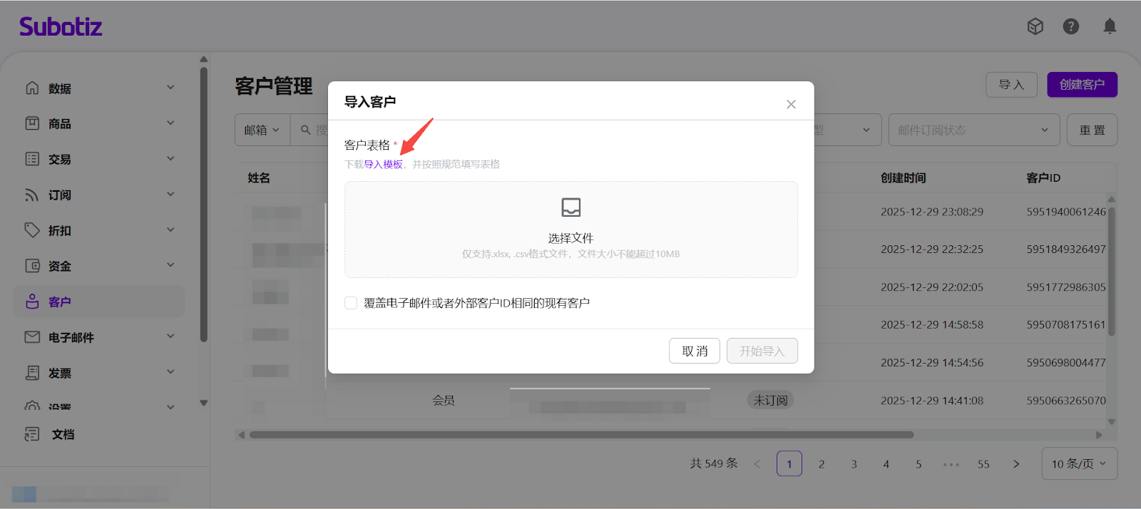 - 打开客户导入入口:登录您的 Subotiz 后台,前往 客户 页面,点击右上角的 导入,打开客户导入弹窗。