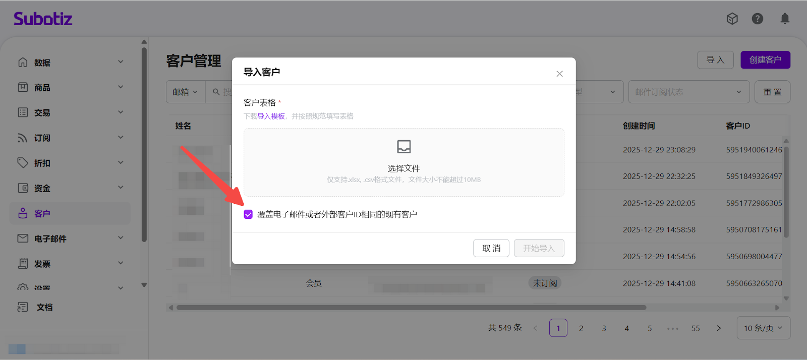 设置覆盖规则(可选): 如需修改系统中已存在的客户信息,请在上传文件时勾选 覆盖电子邮件或者外部客户ID相同的现有客户。