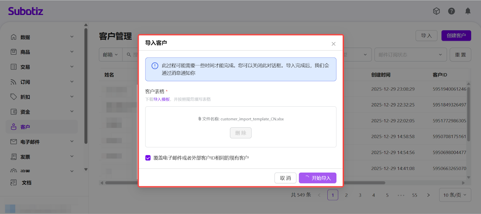 客户导入功能通过模板文件方式,帮助商家高效完成客户资料的批量创建与更新。通过统一的字段规范与覆盖规则,商家可在 Subotiz 中建立清晰、可维护的客户数据基础,为后续客户管理、订阅及运营使用提供支持。