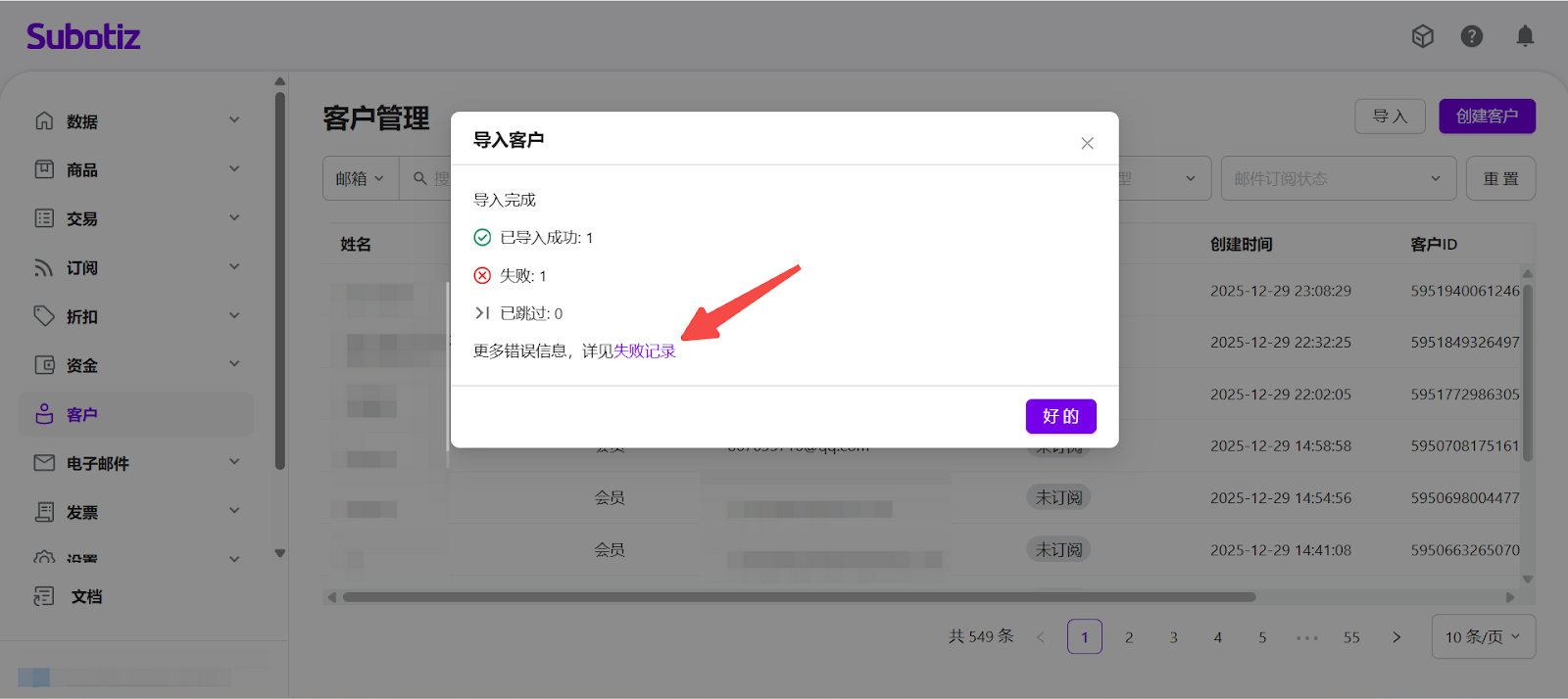 如存在导入失败的记录,可点击 失败记录 下载错误明细文件,查看具体失败原因并修正后重新导入。
