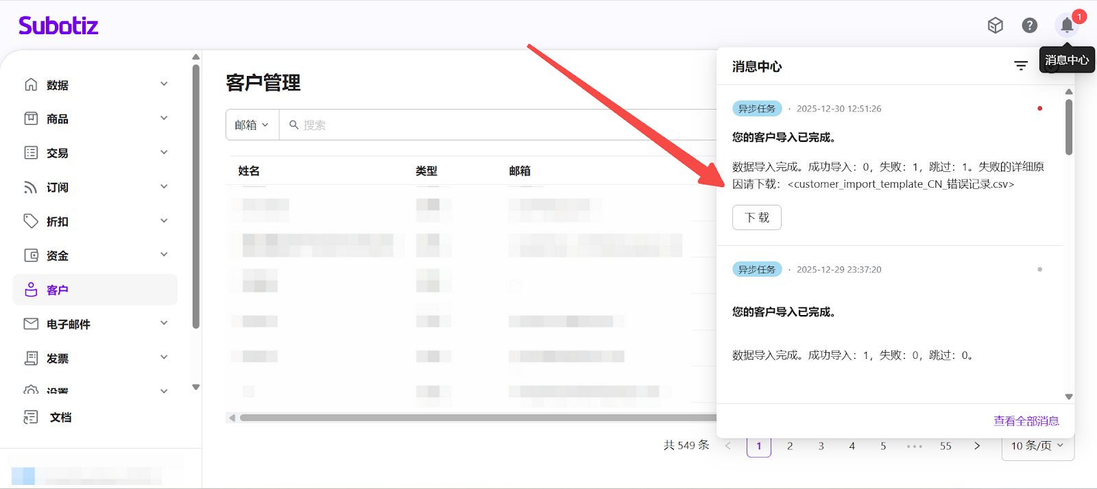 - 通过消息中心查看结果: 若您在导入过程中关闭了弹窗,系统处理完成后将发送消息通知。您可通过右下角消息提醒或 消息中心 查看导入结果,并下载失败记录文件。