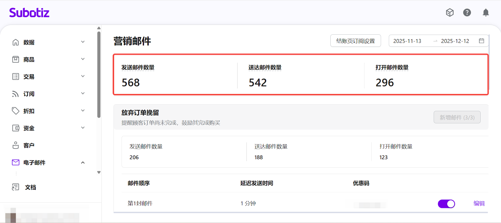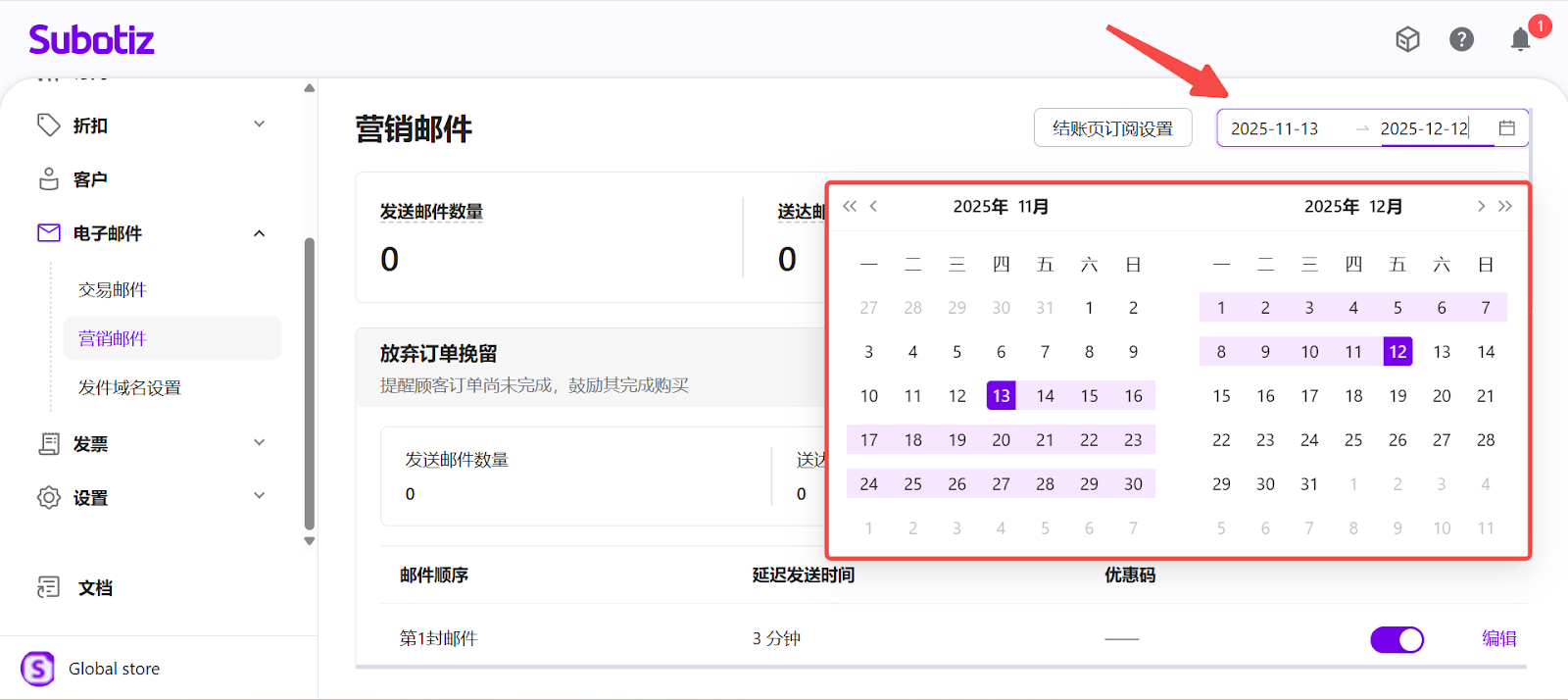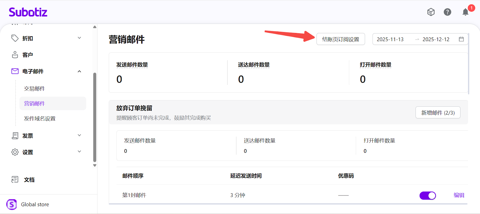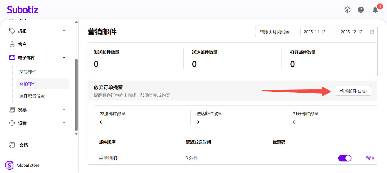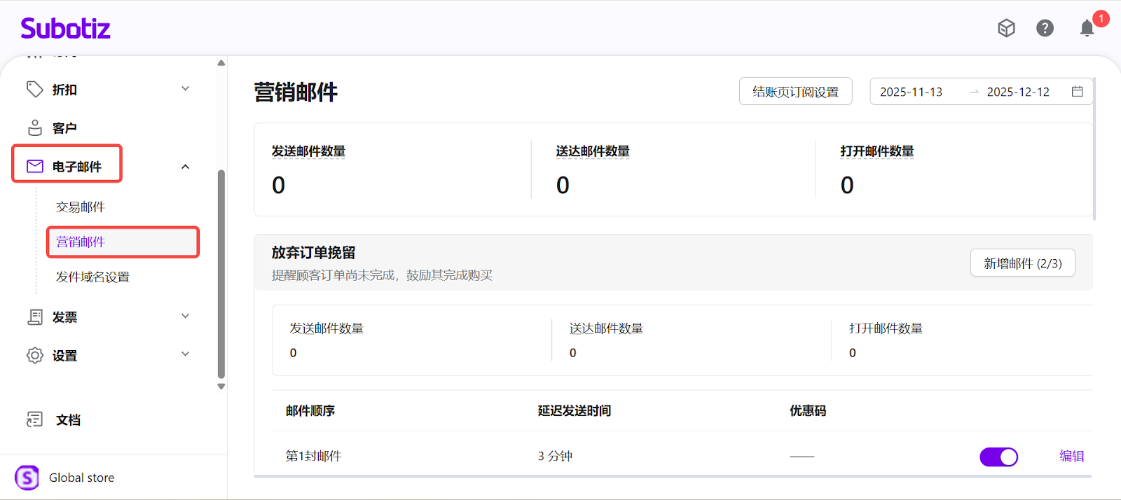 - 进入营销邮件:登录 Subotiz 后台,前往 电子邮件 > 营销邮件。页面将展示三种营销旅程,并汇总所选时间范围内的 发送邮件数量、送达邮件数量 和 打开邮件数量 数据指标。
