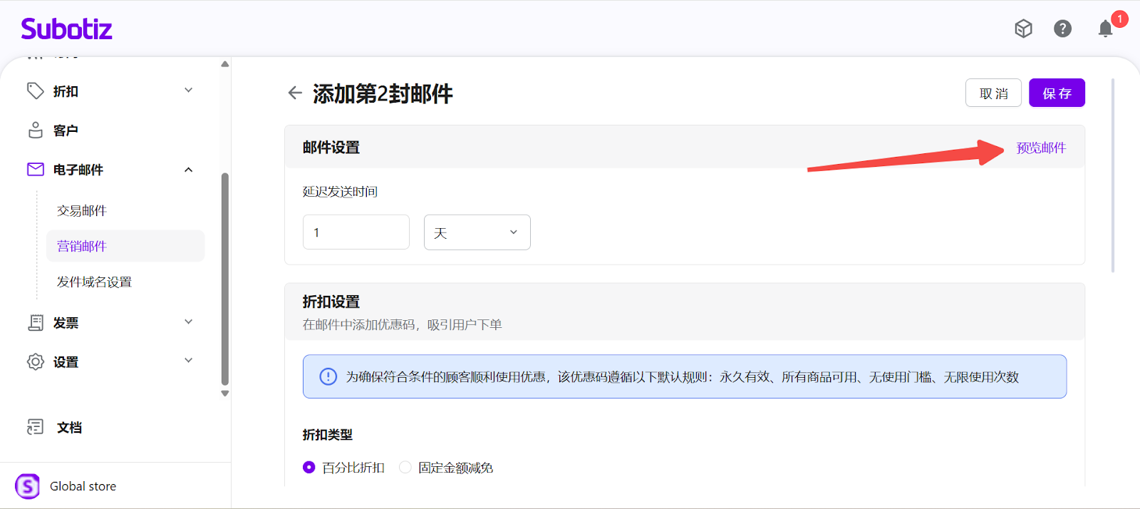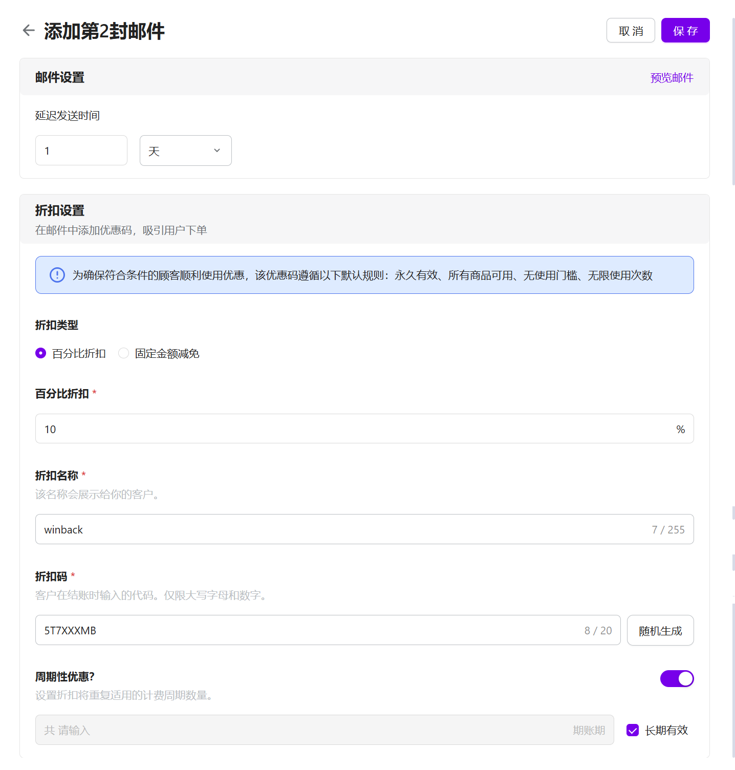 - 结束试用召回、订阅到期召回:必须配置折扣。折扣配置在邮件创建页面内完成