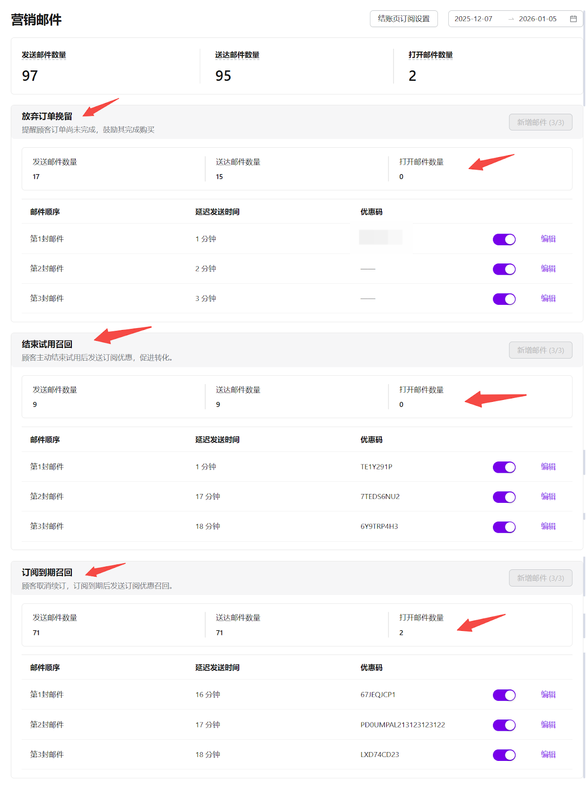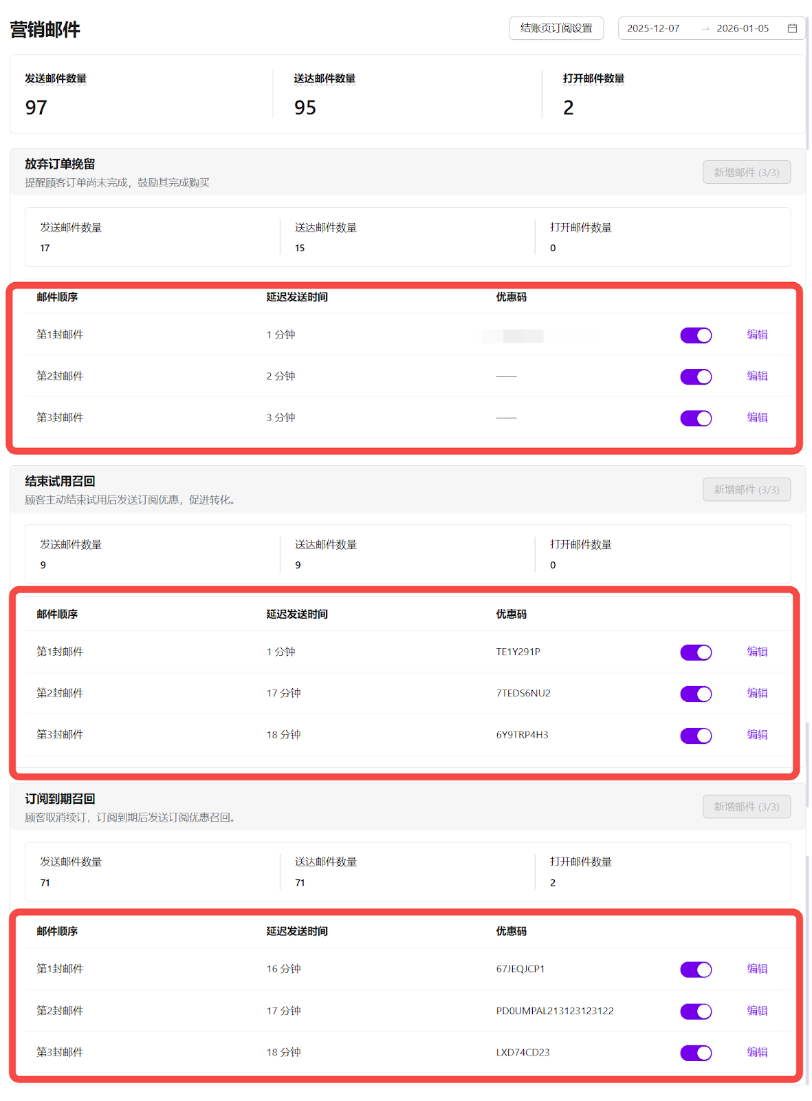营销邮件页面为商户提供了完整的生命周期营销管理能力。通过集中管理邮件顺序、发送时间与订阅授权,并结合清晰的数据指标,商户可在无需额外系统支持的情况下,高效开展留存与召回营销,持续优化客户转化与订阅收入。