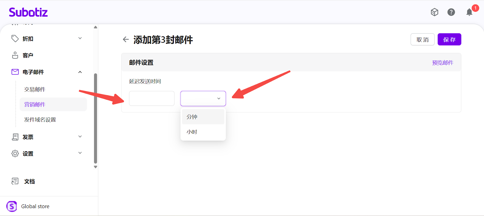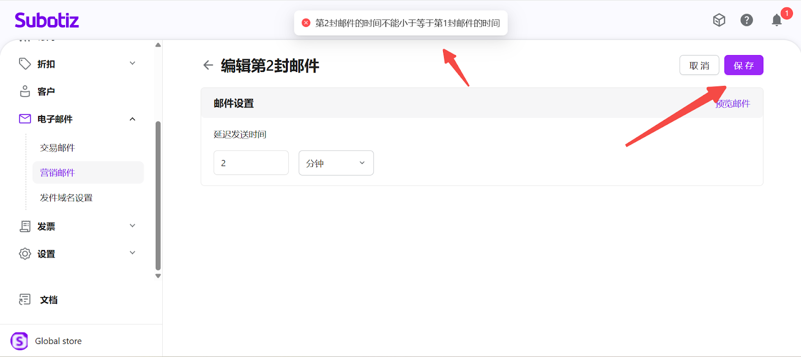 - 保存邮件: 点击 保存 发布配置。系统会校验邮件顺序,确保第 1 封 < 第 2 封 < 第 3 封的延迟时间设置。