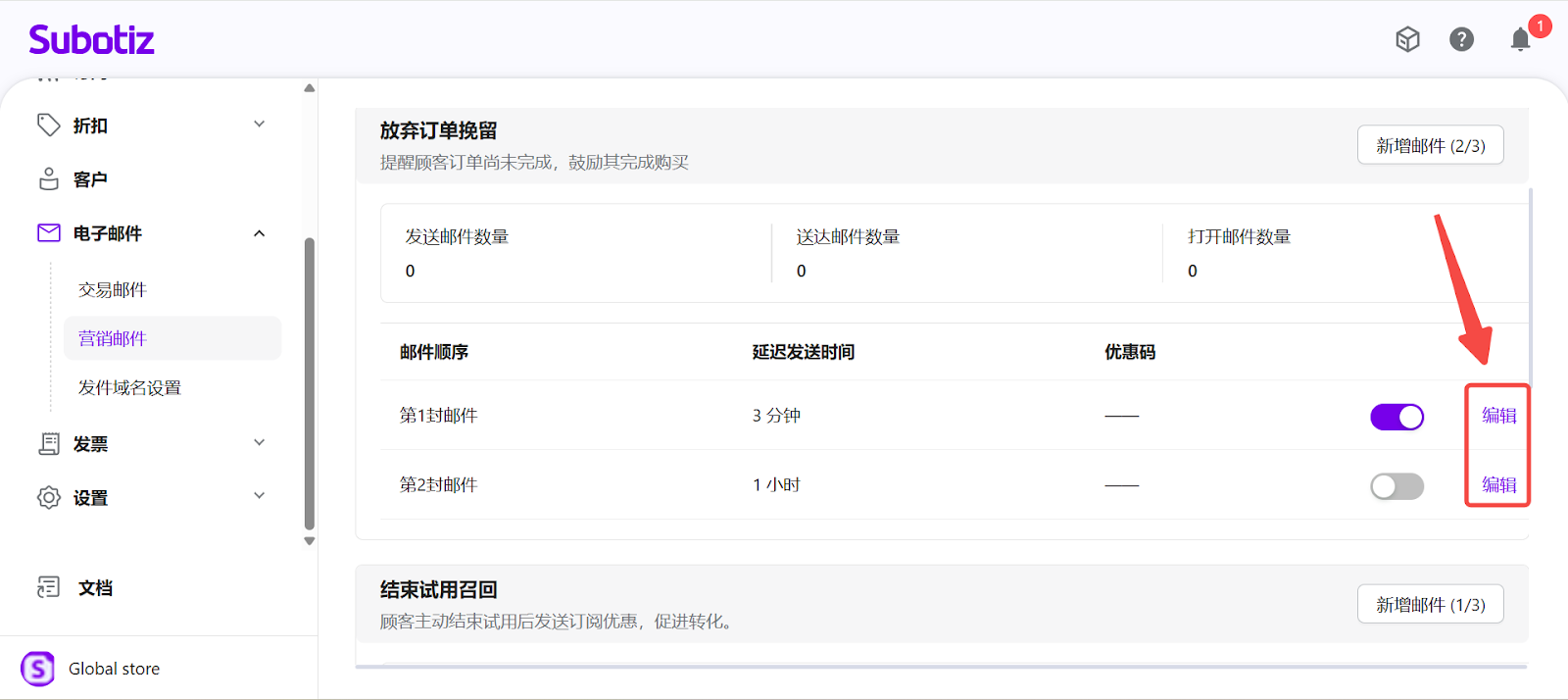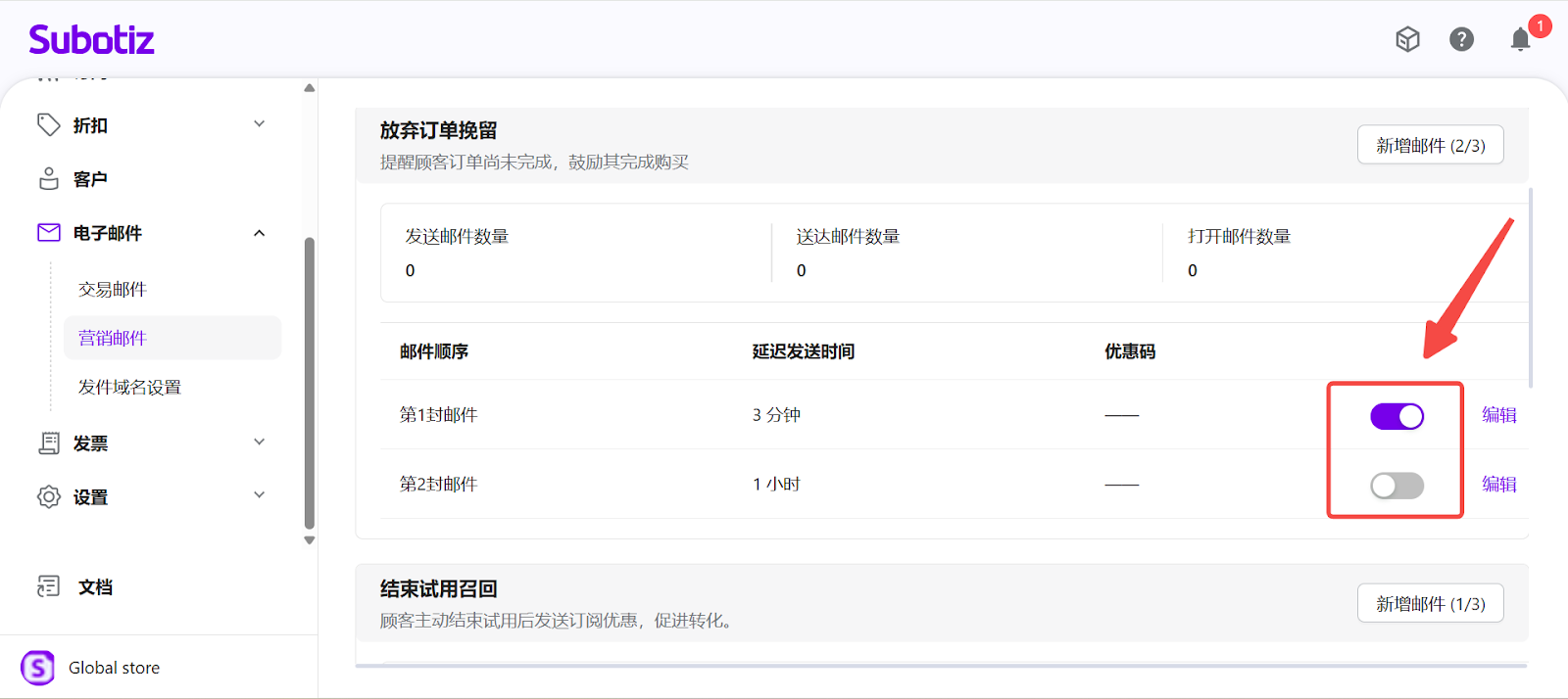Subotiz 的 营销邮件 页面为商户提供一个集中式管理界面,用于统一查看、配置和监控 放弃订单挽留、结束试用召回、订阅到期召回 等营销邮件旅程。通过该页面,商户可统一管理邮件发送顺序、设置延迟时间,并实时查看各生命周期节点的营销表现。