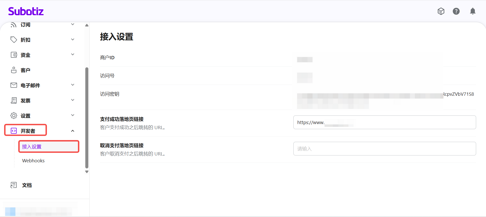 登录 Subotiz 后台,进入 开发者 > 接入设置,即可查看系统生成的凭证信息及可配置的跳转 URL。该页面展示的凭证字段均为只读,用于支付流程及 API 对接时的身份认证与授权。