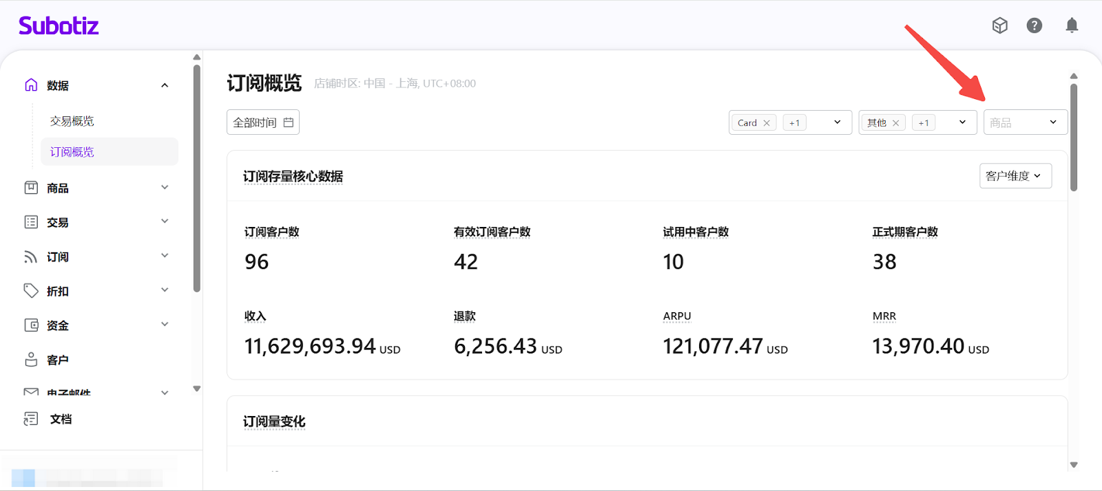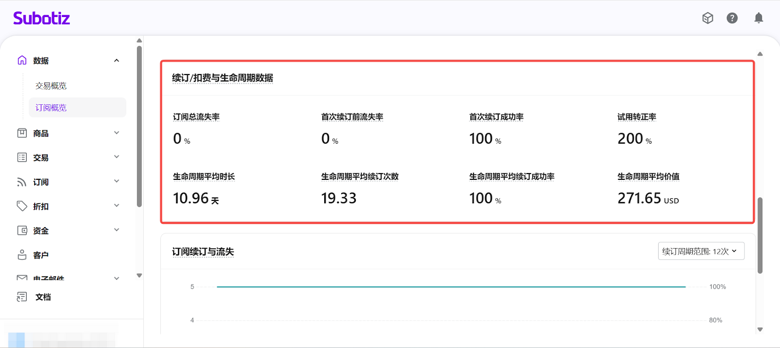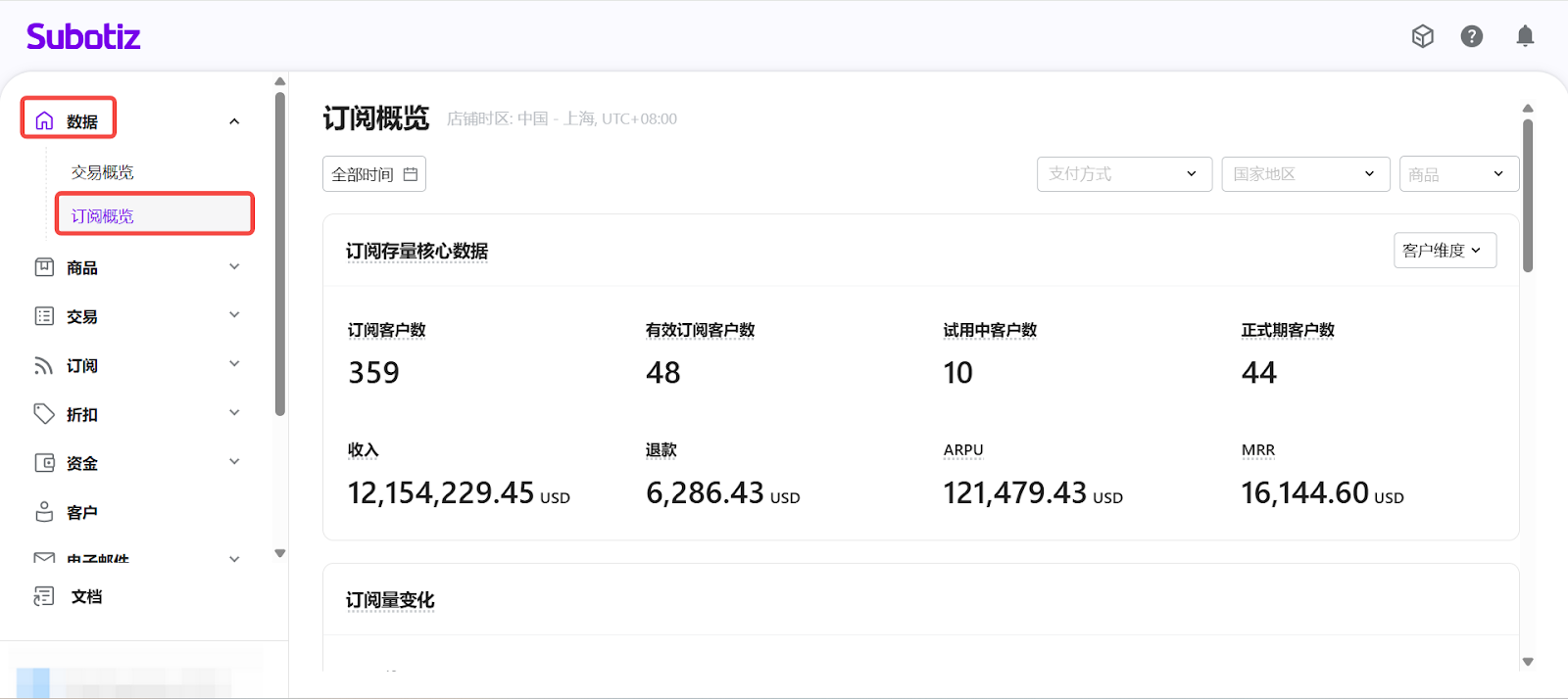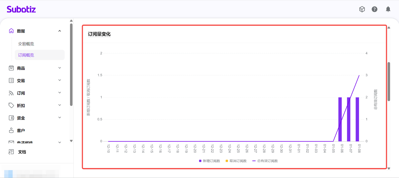- 進入订阅概览: 在 Subotiz 后台,前往 数据 > 订阅概览, 进入订阅数据分析页面。