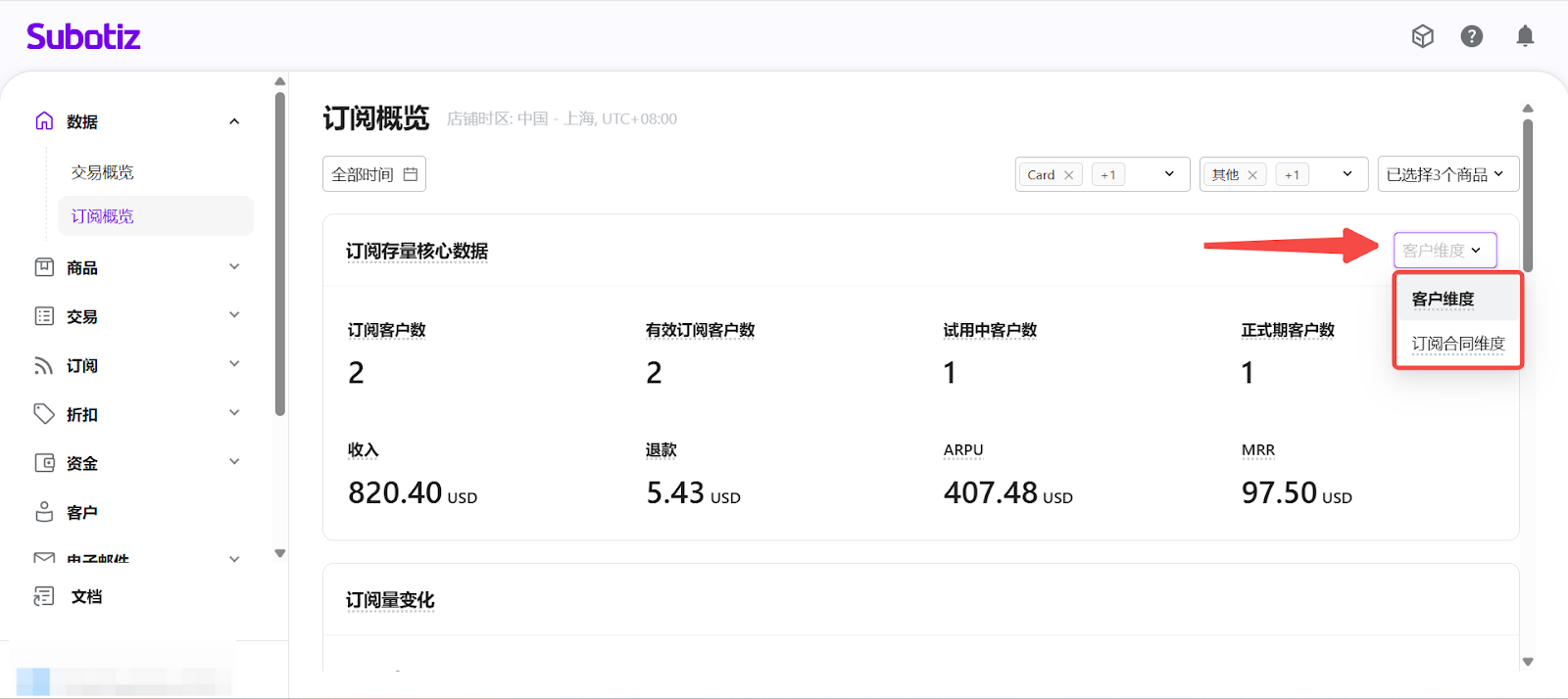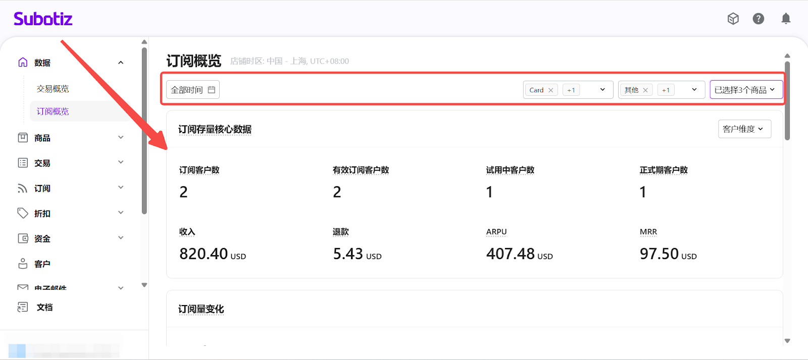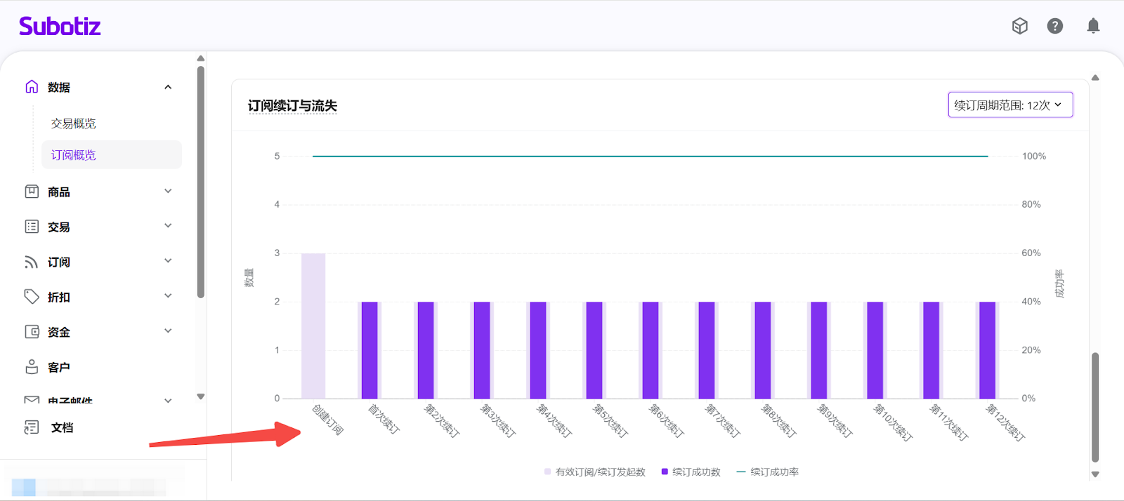 - 進入订阅概览: 在 Subotiz 后台,前往 数据 > 订阅概览, 进入订阅数据分析页面。