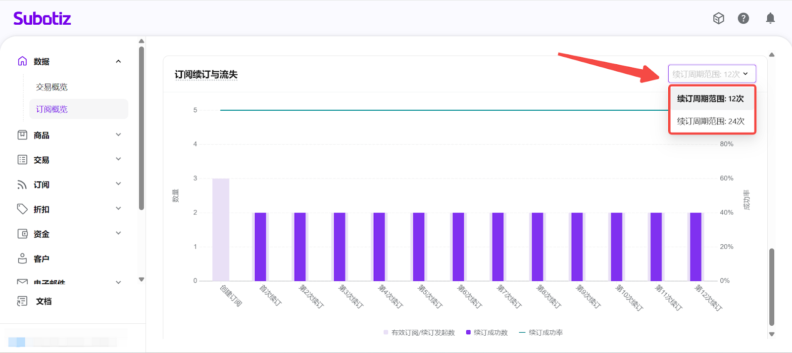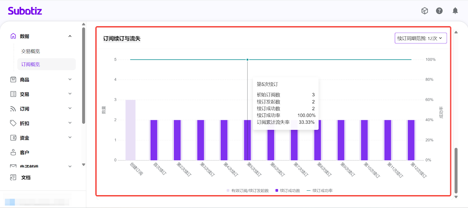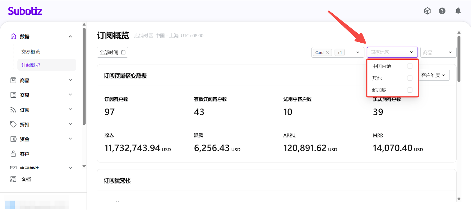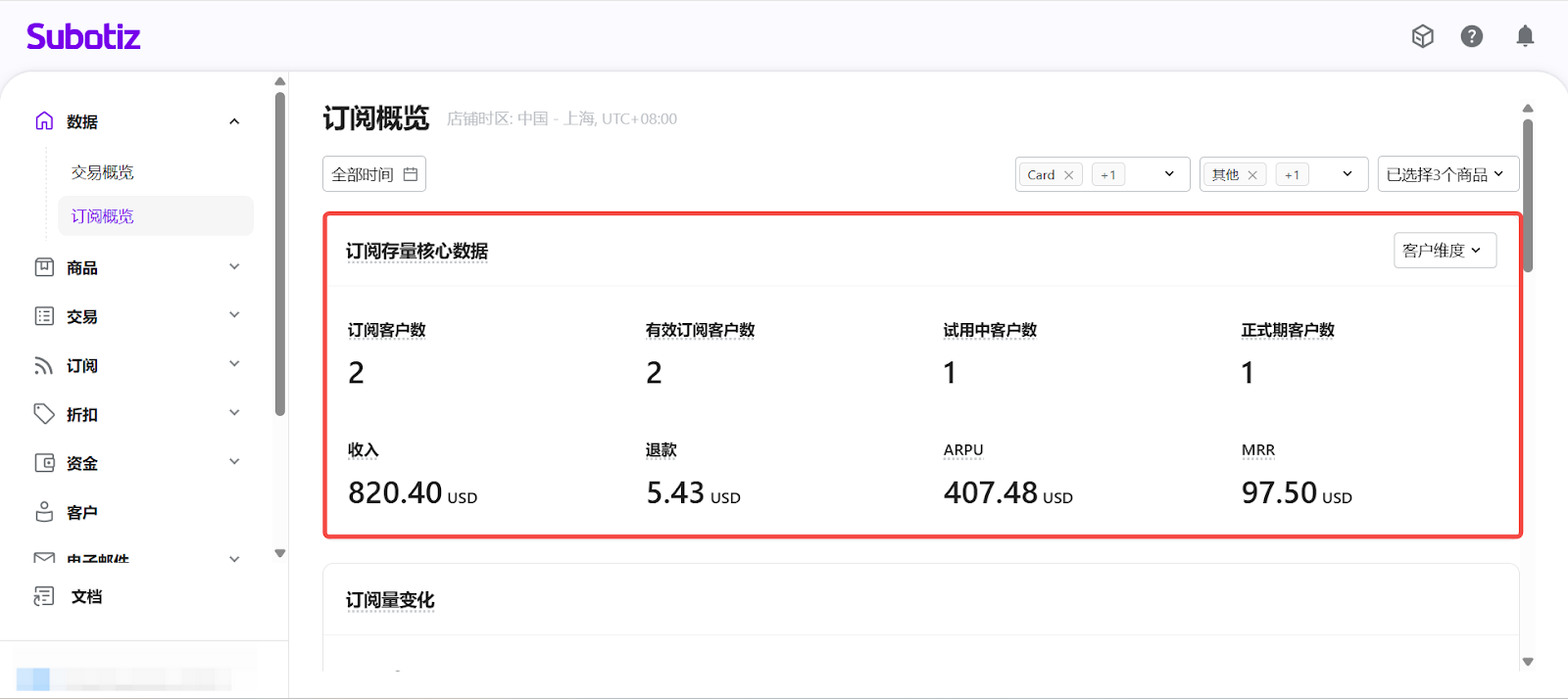 - 進入订阅概览: 在 Subotiz 后台,前往 数据 > 订阅概览, 进入订阅数据分析页面。