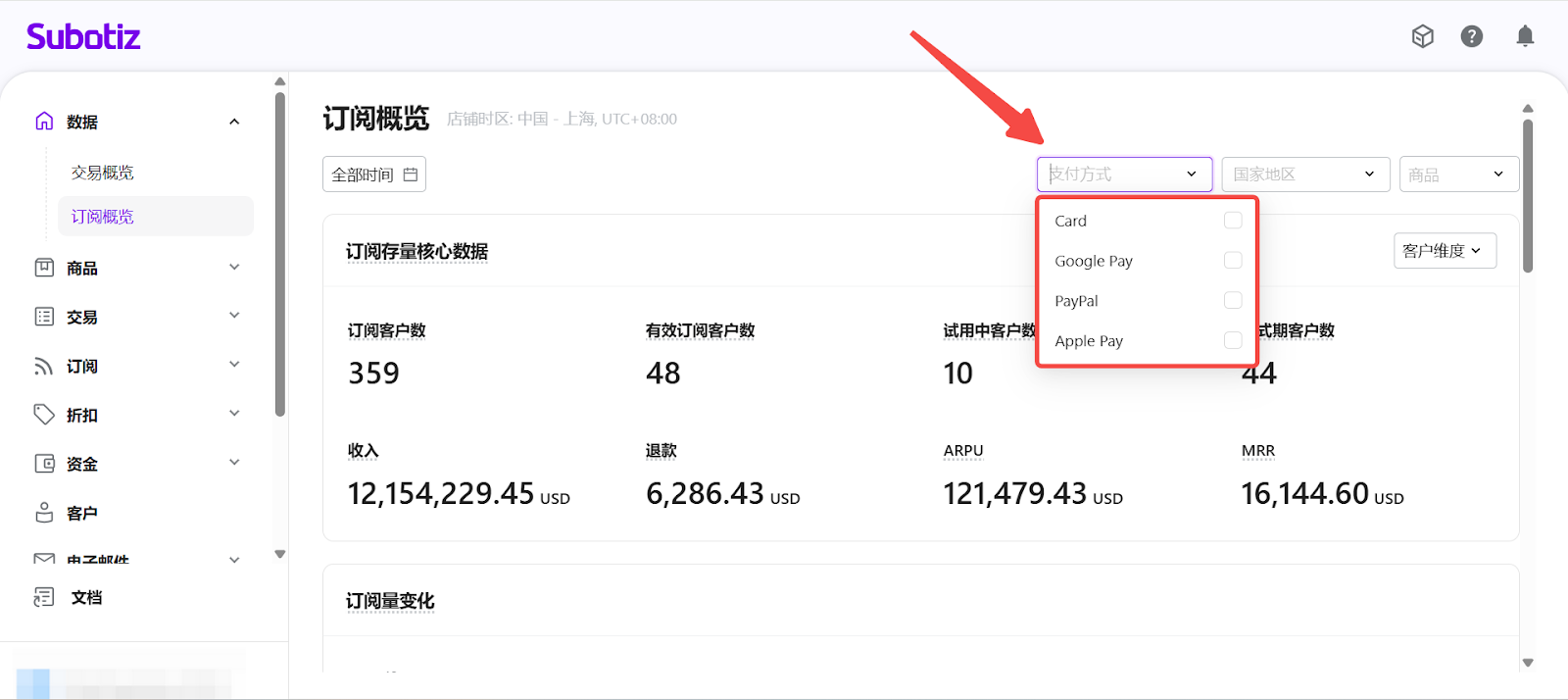 - 支付方式: 支付方式筛选用于限定订阅所使用的付款渠道,仅统计通过所选支付方式完成的订阅数据。