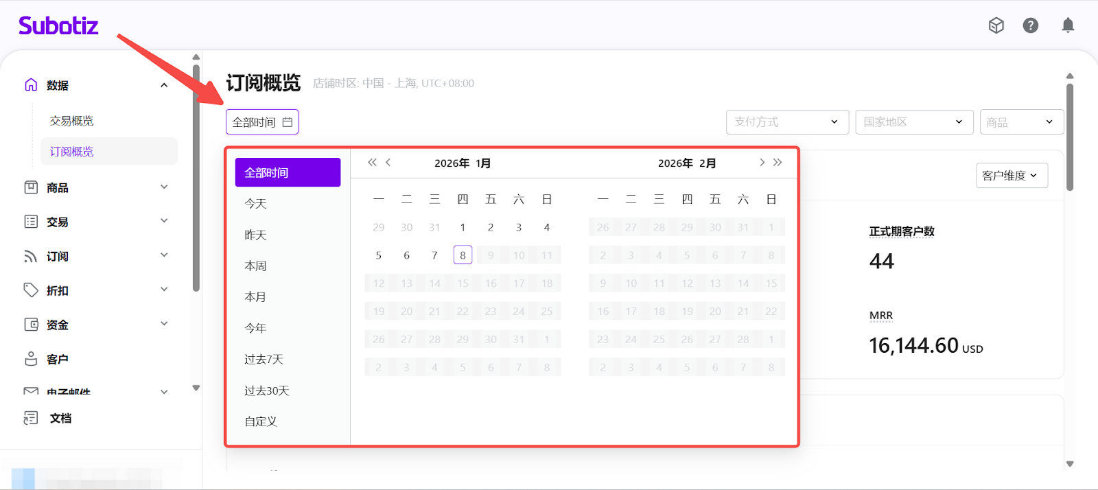 订阅概览 是 Subotiz 数据模块中的核心分析视图,用于集中分析 订阅业务表现。该页面从订阅规模、收入表现、续订行为及生命周期等多个维度,统一展示商家在选定时间范围内的 订阅数据分析 结果,帮助商家系统评估订阅业务的增长质量与长期价值。