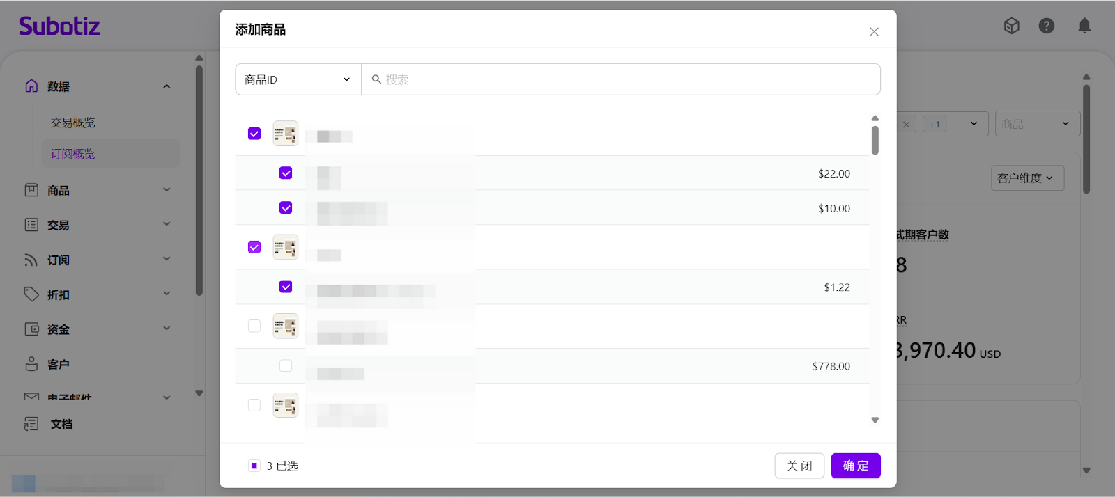 当选择多个商品时,系统将对所选商品对应的订阅数据进行汇总,用于分析产品组合层面的订阅表现。