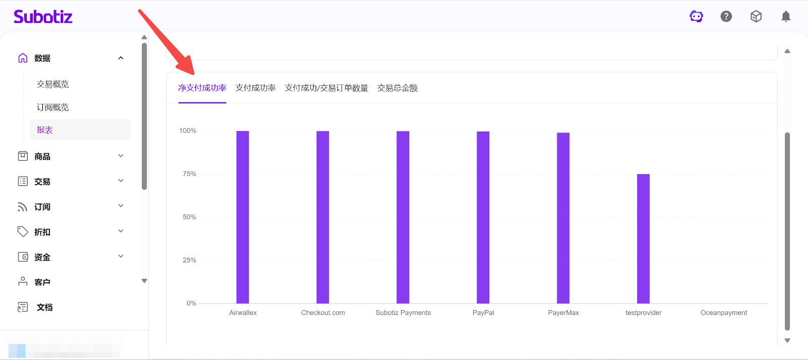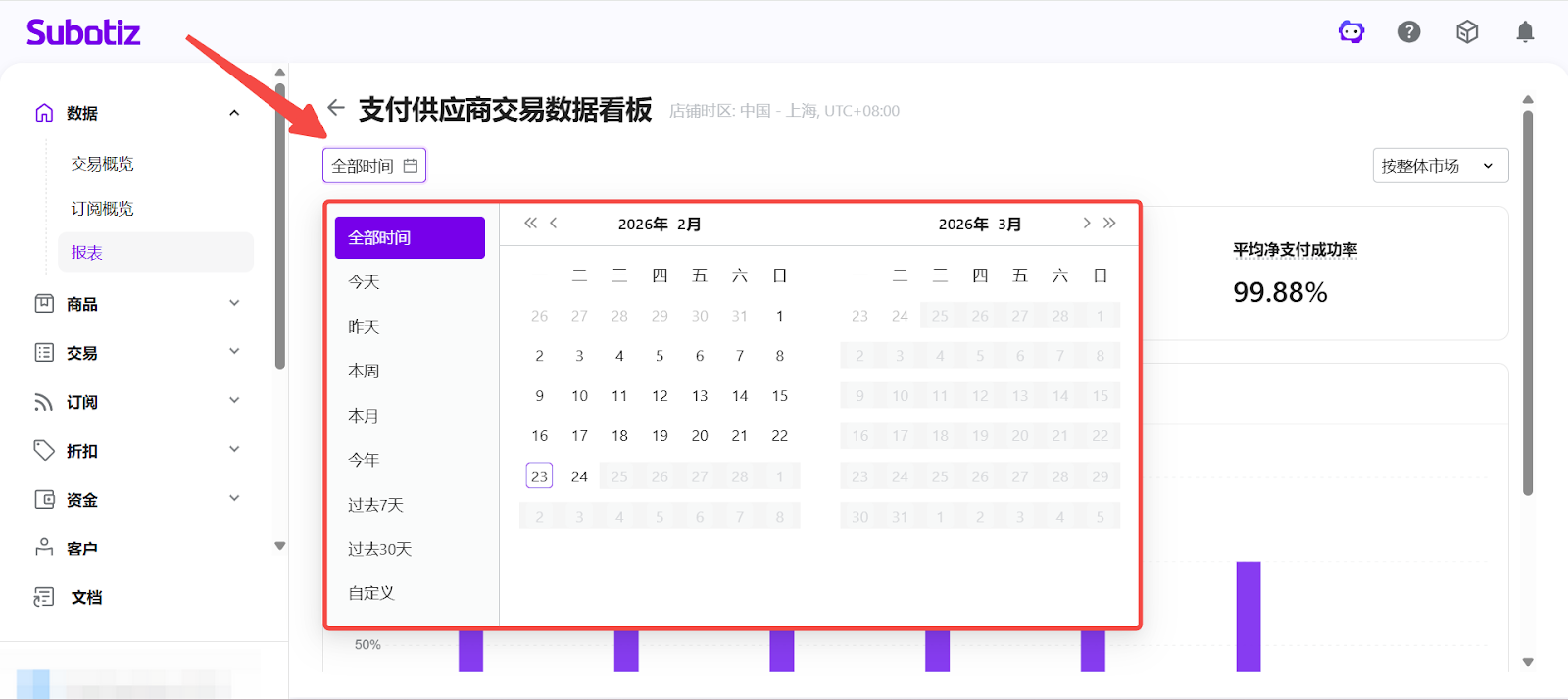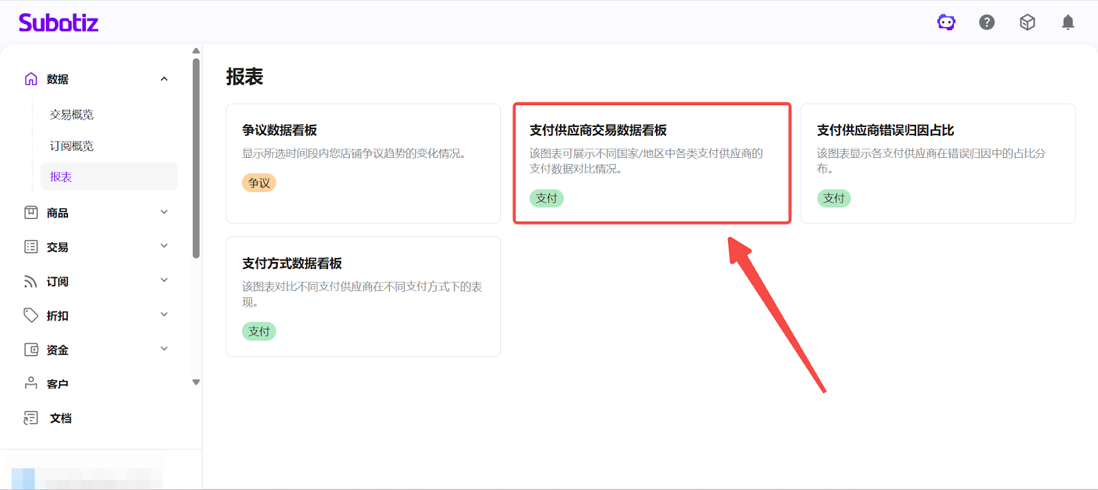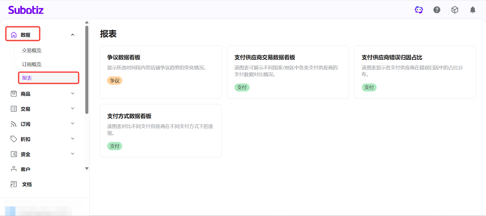 - 打开报表模块:在 Subotiz 后台点击 数据 > 报表。