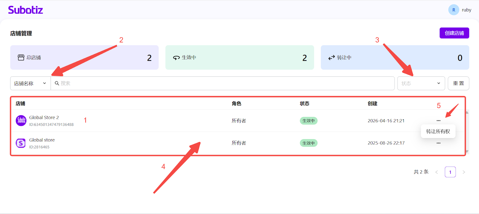 - 转让所有权:在目标店铺行点击操作菜单,选择 转让所有权。