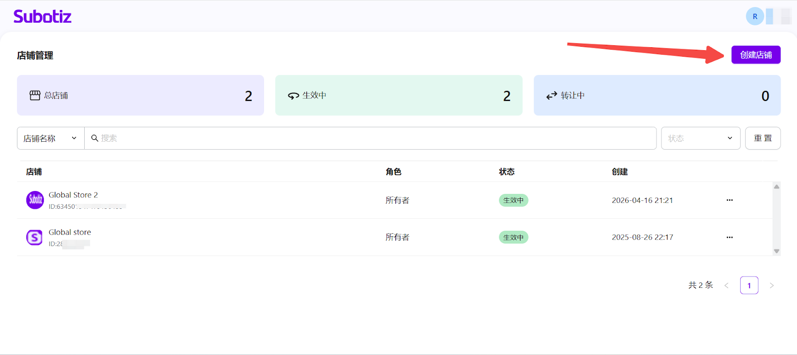 Subotiz 的 创建店铺 功能允许商户在同一账号下创建多个店铺,并在统一的 店铺管理页面 进行查看与管理。该功能适用于多品牌运营或合作伙伴模式,帮助商户高效扩展业务并集中管理 多店铺 资源。